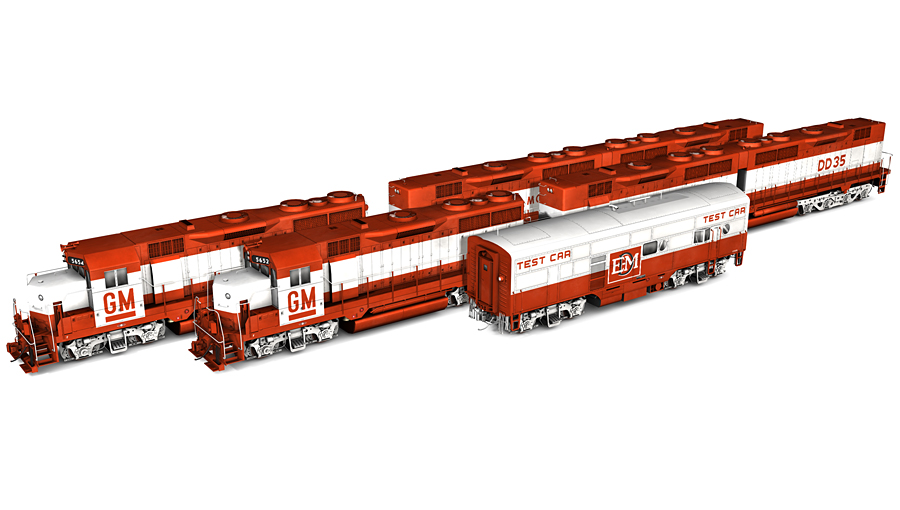 General Motors 1963 Demonstrator Set. Includes GP35s 5652 and 5654; DD35s 5653 and 5655. Set comes with EMD Engineering Test Car 909.