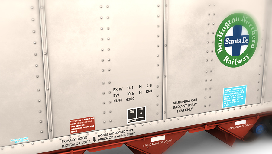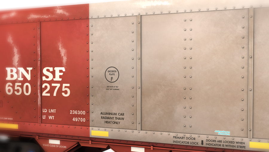 FreightCar America, formerly known as Johnstown America, is most recognized for their construction of aluminum freight cars for North American railways. The benefits behind aluminum railcars are their ability to hold more product and the possibility of increased fuel savings because of aluminum's light weight as compared to a steel-built freight car. FreightCar America is best known for their aluminum coal hoppers, the AutoFlood II is no exception. The AutoFlood can be unloaded through either the bottom doors, or through a rotary dumper.
