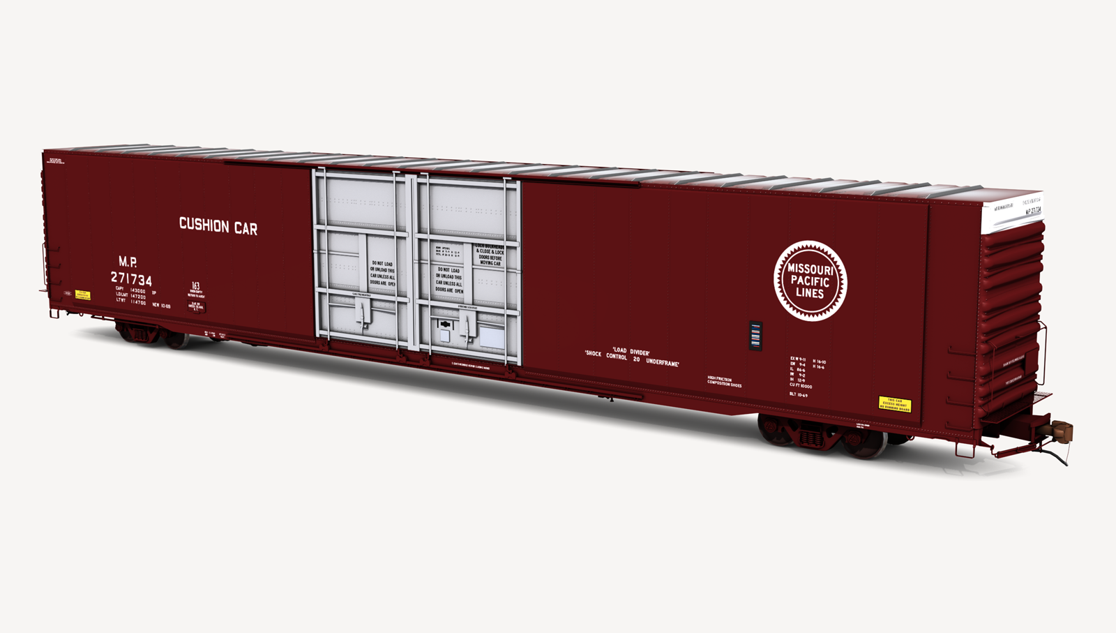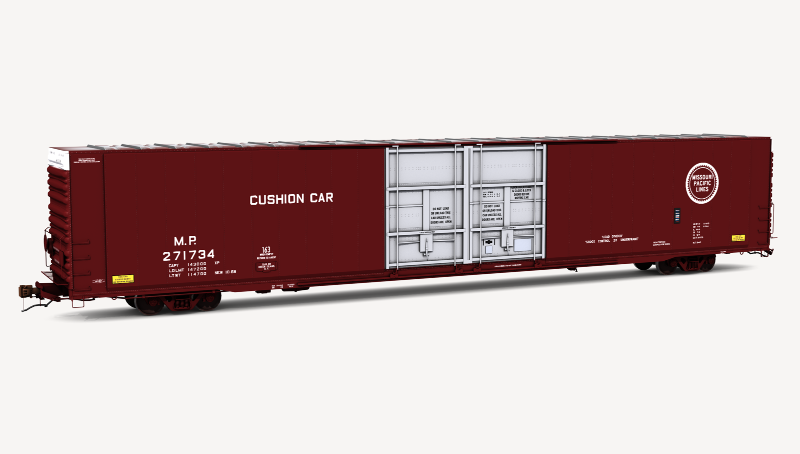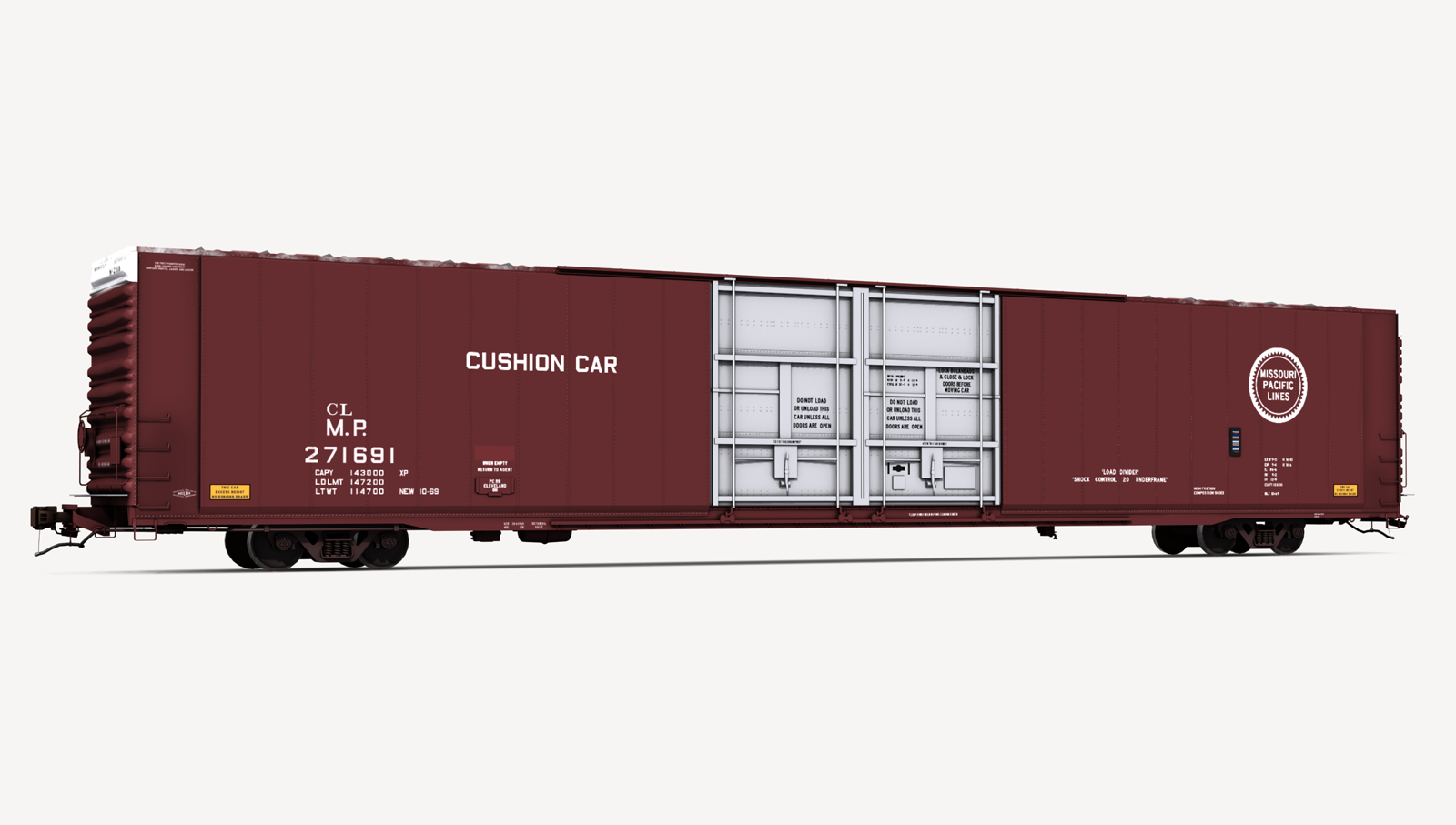 Missouri Pacific Greenville Steel Car 86'6" auto parts boxcar. Includes two (2) boxcar skins.