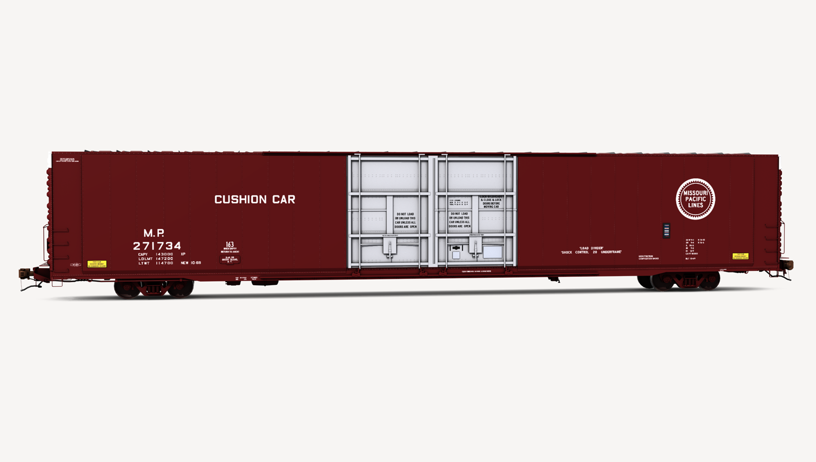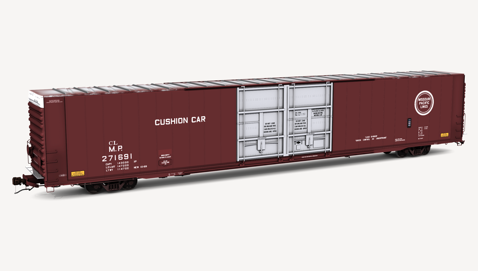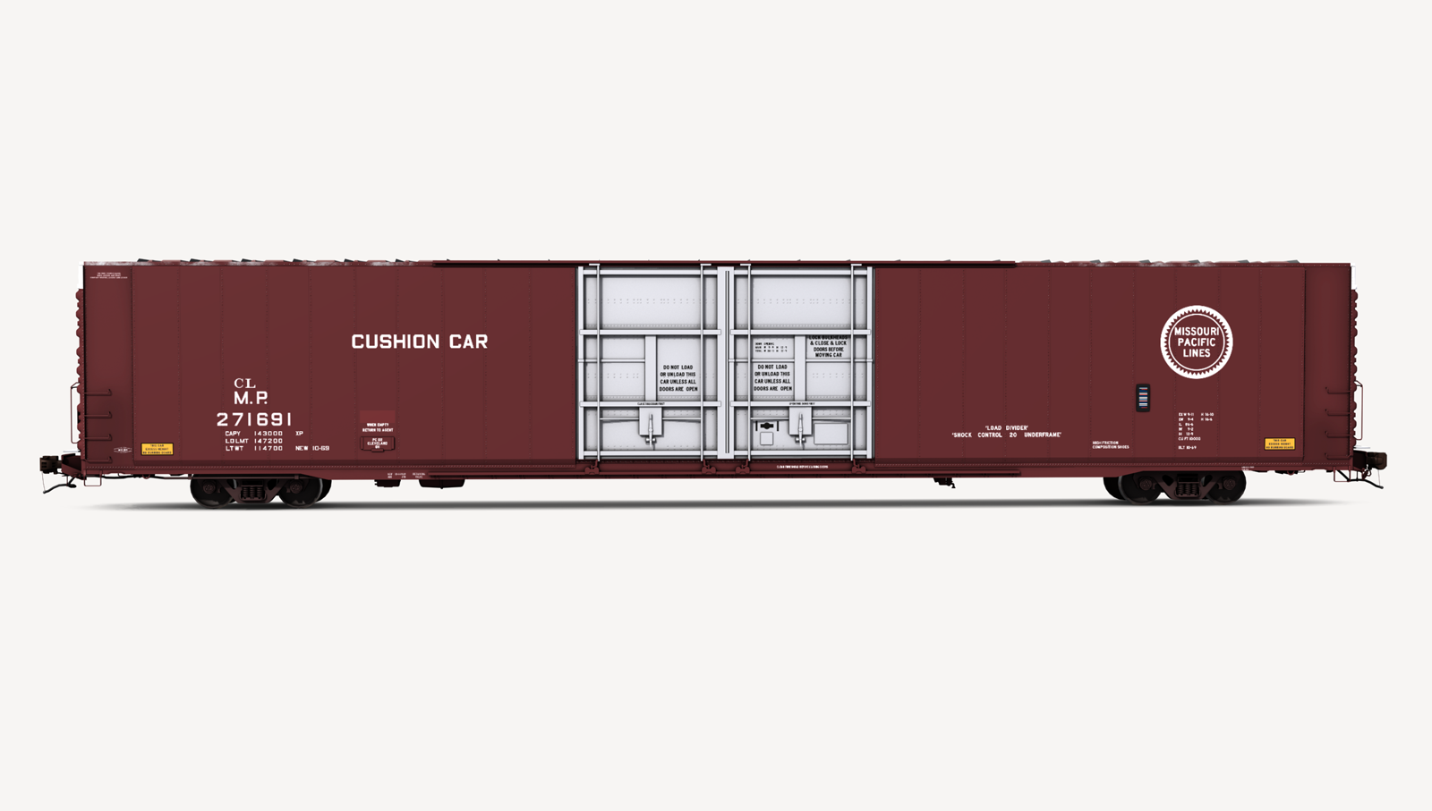 Missouri Pacific Greenville Steel Car 86'6" auto parts boxcar. Includes two (2) boxcar skins.
