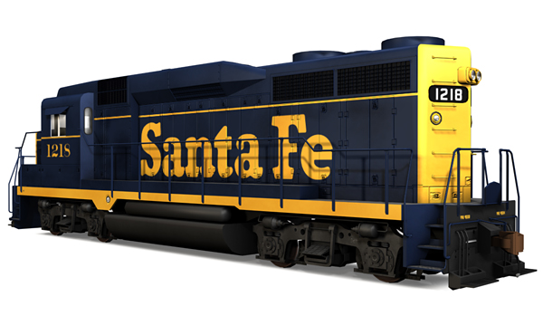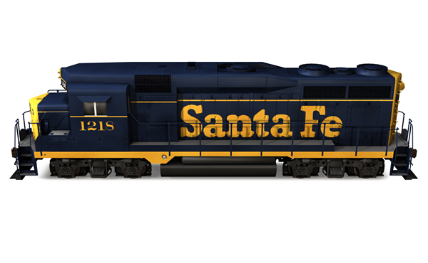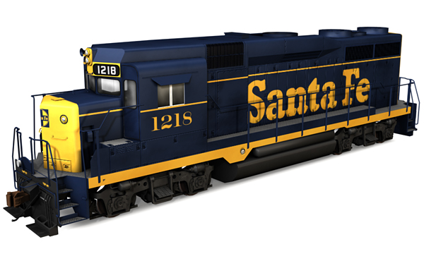 Atchison Topeka & Santa Fe EMD General Purpose 30 locomotive, road number 1218. Locomotive features animated cooling fans, animated wheels, custom horn and bell sounds, bump-mapped textures, and level-of-detail reduction meshes.