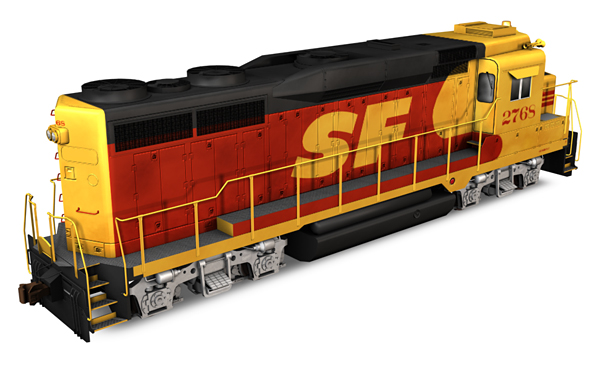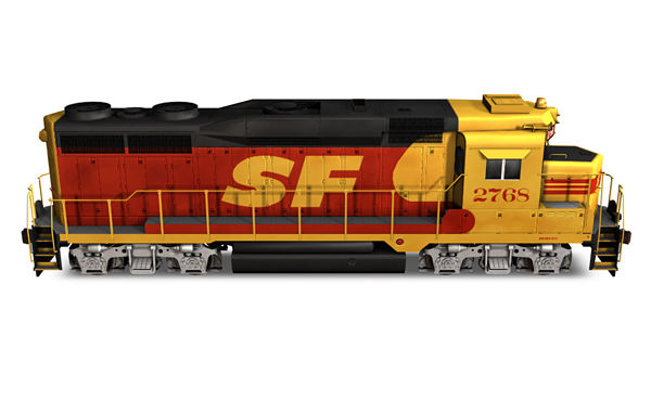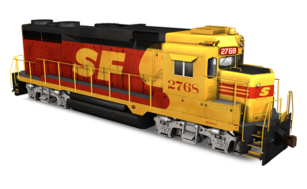 Atchison Topeka & Santa Fe EMD General Purpose 30 locomotive, road number 2768. Locomotive features animated cooling fans, animated wheels, custom horn and bell sounds, bump-mapped textures, and level-of-detail reduction meshes.
