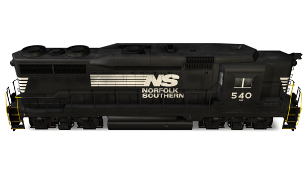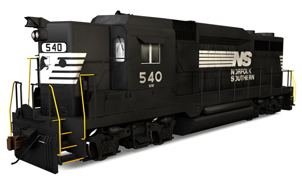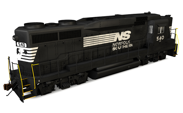 Norfolk & Southern EMD General Purpose 30 locomotive, road number 540. Locomotive features animated cooling fans, animated wheels, custom horn and bell sounds, bump-mapped textures, and level-of-detail reduction meshes.