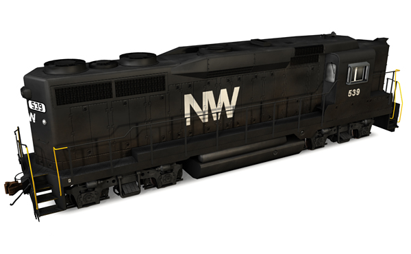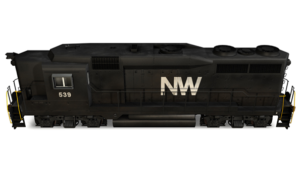 Norfolk & Western EMD General Purpose 30 locomotive, road number 539. Locomotive features animated cooling fans, animated wheels, custom horn and bell sounds, bump-mapped textures, and level-of-detail reduction meshes.