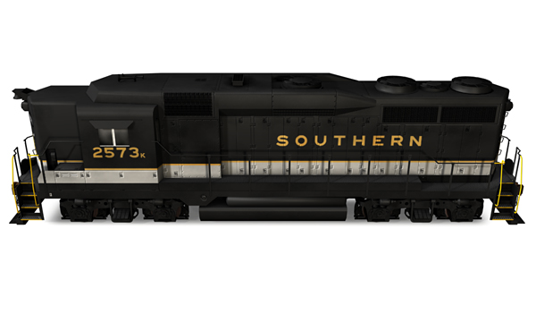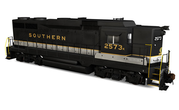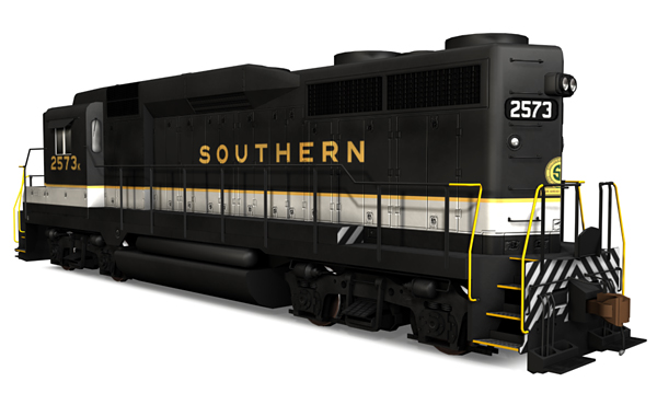 Southern EMD General Purpose 30 locomotive, road number 2573. Locomotive features animated cooling fans, animated wheels, custom horn and bell sounds, bump-mapped textures, and level-of-detail reduction meshes.