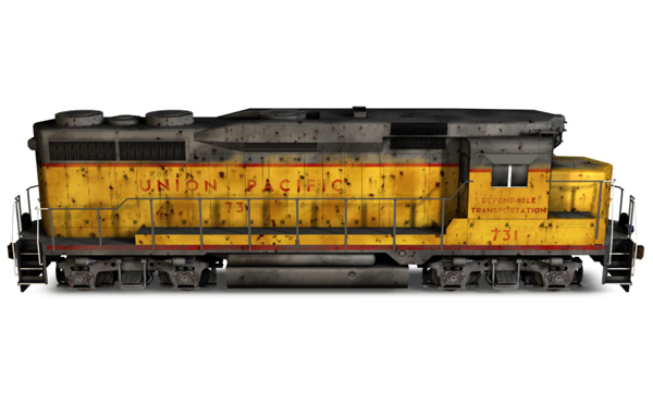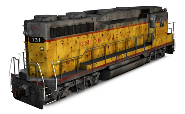 Union Pacific EMD General Purpose 30 locomotive, road number 731. Locomotive features animated cooling fans, animated wheels, custom horn and bell sounds, bump-mapped textures, and level-of-detail reduction meshes.