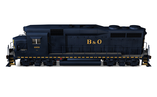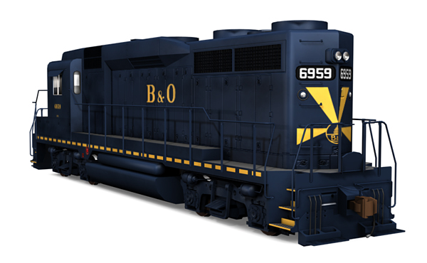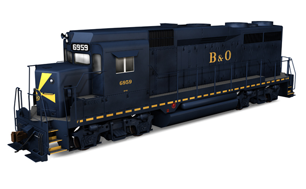 Baltimore & Ohio EMD General Purpose 30 locomotive, road number 6959. Locomotive features animated cooling fans, animated wheels, custom horn and bell sounds, bump-mapped textures, and level-of-detail reduction meshes.