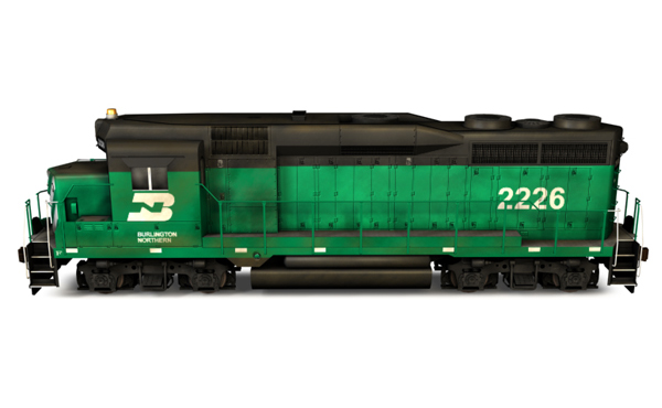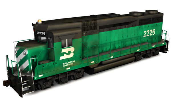 Burlington & Northern EMD General Purpose 30 locomotive, road number 2226. Locomotive features animated cooling fans, animated wheels, custom horn and bell sounds, bump-mapped textures, and level-of-detail reduction meshes.