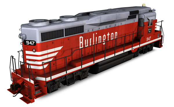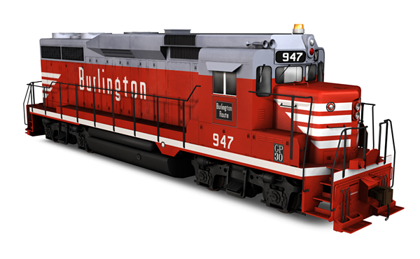 Chicago Burlington & Quincy EMD General Purpose 30 locomotive, road number 947. Locomotive features animated cooling fans, animated wheels, custom horn and bell sounds, bump-mapped textures, and level-of-detail reduction meshes.