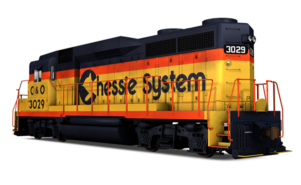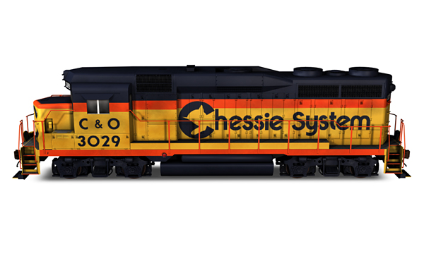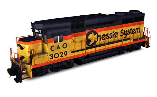 Chesapeake & Ohio EMD General Purpose 30 locomotive, road number 3029. Locomotive features animated cooling fans, animated wheels, custom horn and bell sounds, bump-mapped textures, and level-of-detail reduction meshes.