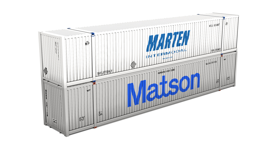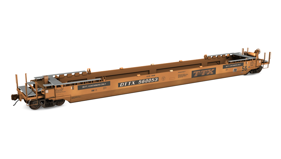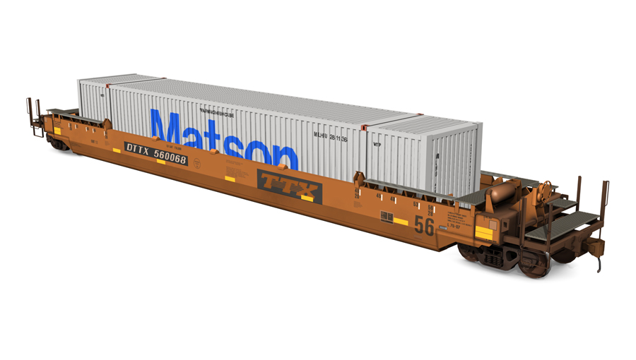 2015 Gunderson Husky Stack 2+2. Includes two (2) 53' domestic containers and three (3) roadnumbers. Containers can be used as scenery objects.