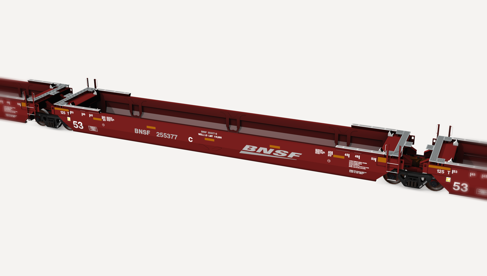 The Gunderson Maxi-Stack IV, introduced in 1999, is the contemporary mainstay of modern domestic intermodal rail car fleets. The Maxi-Stack IV is a 3-unit articulated well car that utilizes 70 ton trucks at the ends, and 125 ton trucks at the articulated connectors.