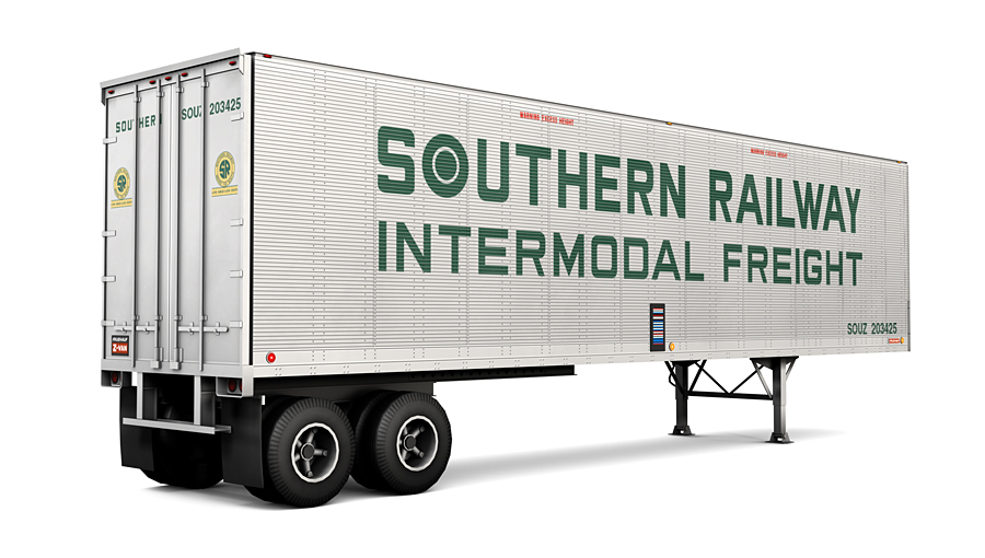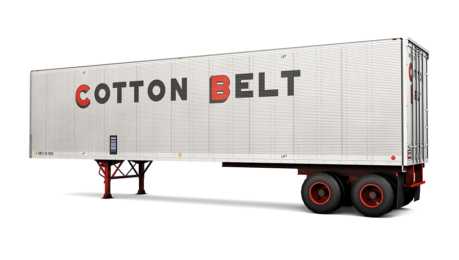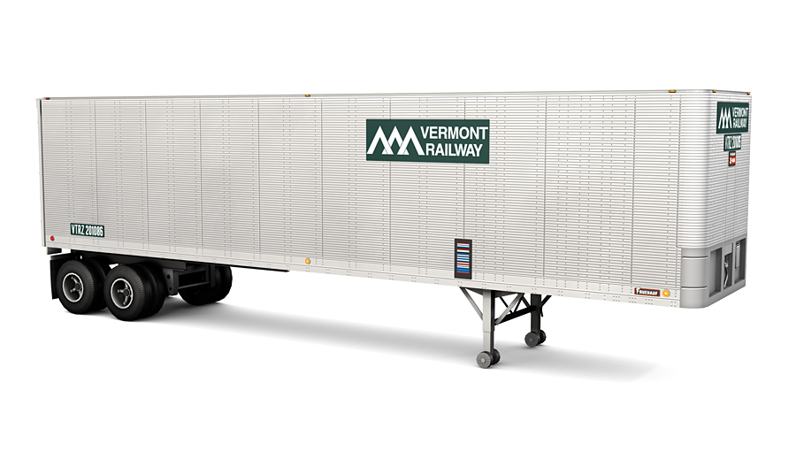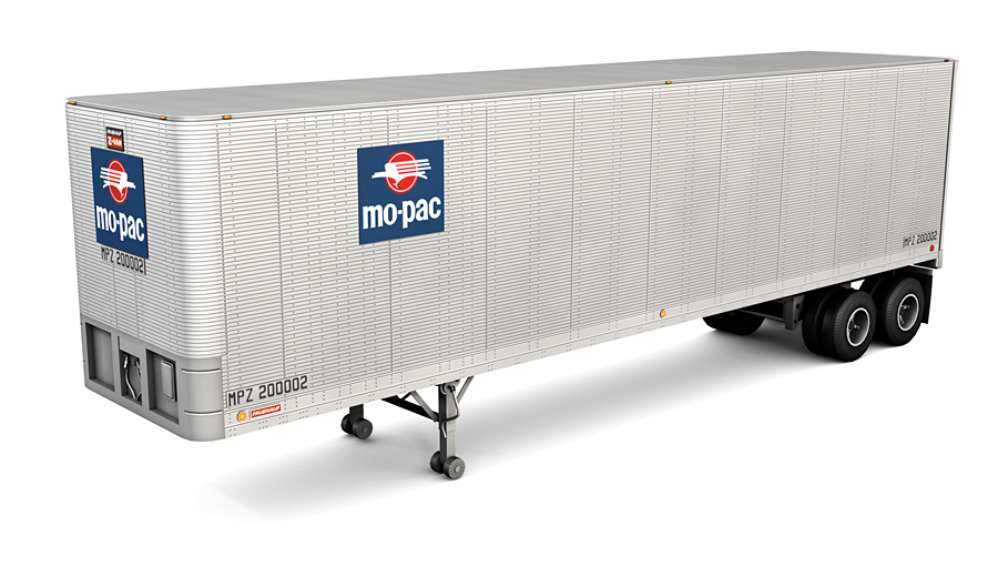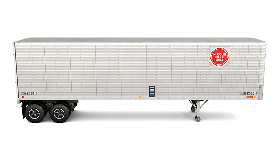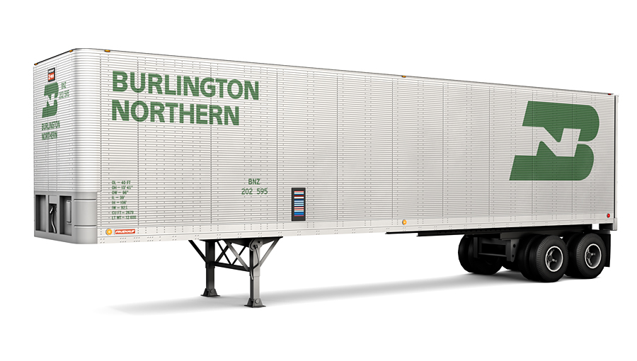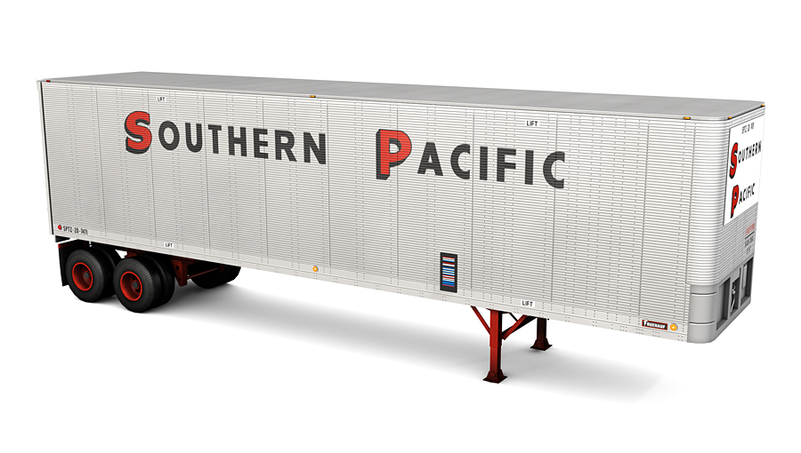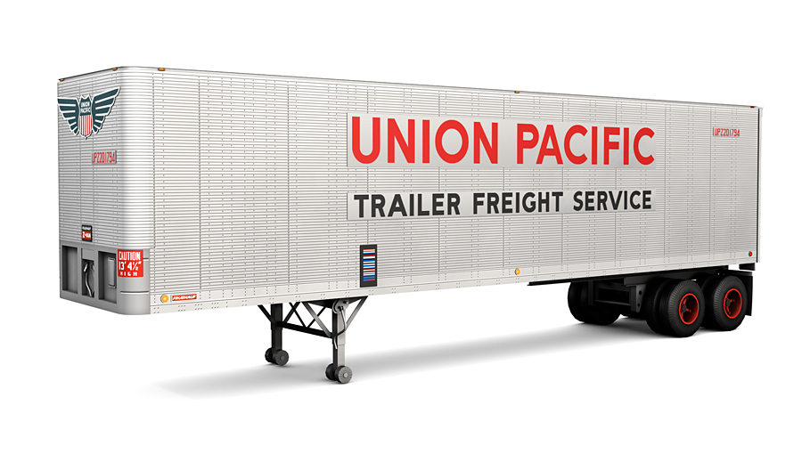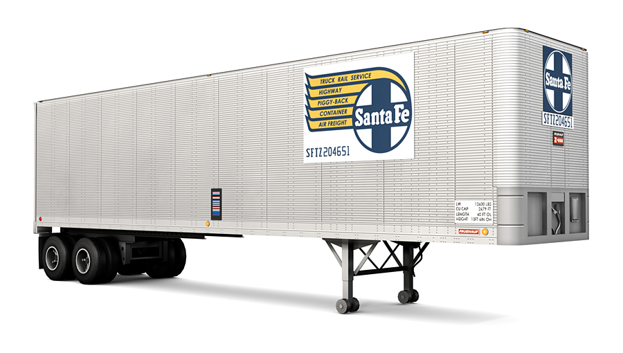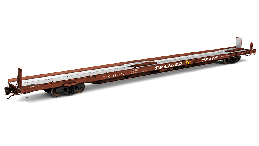 Pullman Standard F85B piggyback flatcar, Trailer Train oxide red. Includes ten (10) 40' Fruehauf beaded Z-Van trailers.
