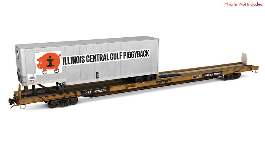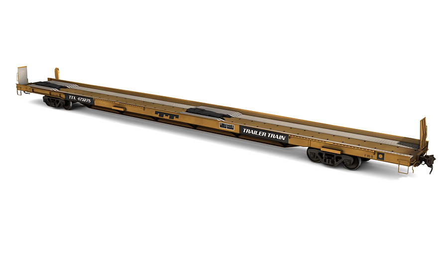 Pullman Standard F85B piggyback flatcar in Trailer Train 1970s yellow, weathered.